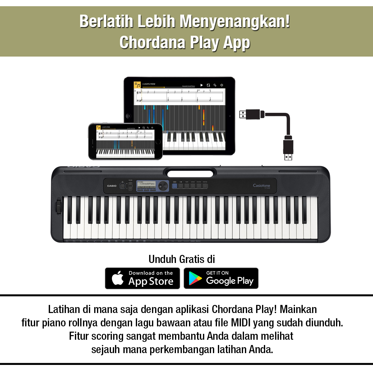 CASIO CT-S300 memberikan fitur yang tak terbayangkan ada di sebuah keyboard portabel. Permainan Anda lebih ekspresif dan dinamis dengan fitur touch response dan pitch bend wheel yang dimiliki oleh keyboard ini. Dengan koneksi ke aplikasi gratis Chordana Play, belajar musik pun menjadi jauh lebih menyenangkan!