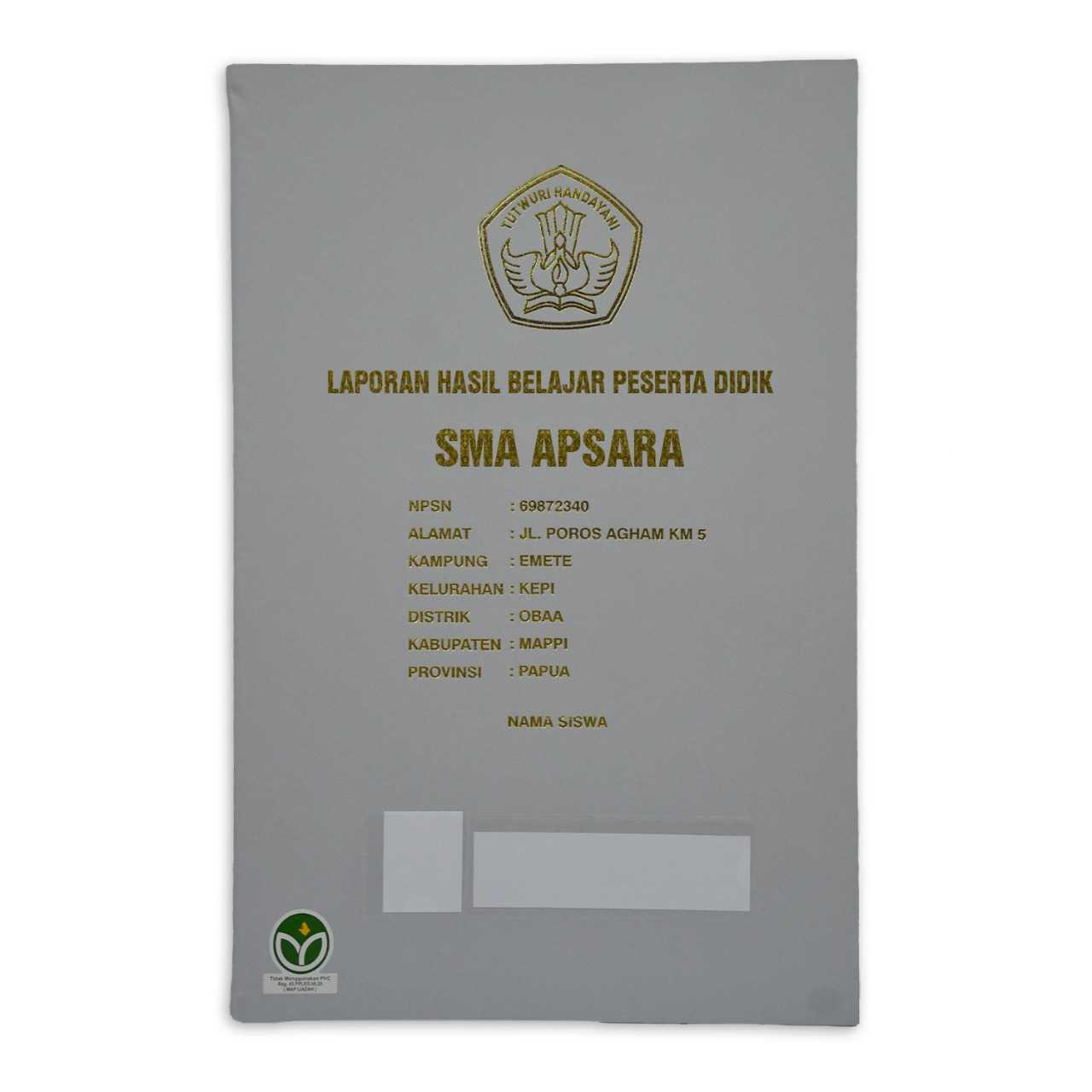 Harga di Pulau Jawa| Deskripsi: Pesanan Minimal 50 pcs. Map Rapor Hot Print Foil Emas: Dimensi Board: Lebar 24,2 cm, Panjang 38 cm, Lebar/Punggung 2 cm. Warna Tersedia: Biru (Kode-01); Hijau Tua (Kode-04); Grey (Kode-05); Hitam (Kode-10); Maroon (Kode-14), Lemon (Kode-26). Desain Cover bisa disesuaikan dengan Identitas Sekolah/Lembaga. |